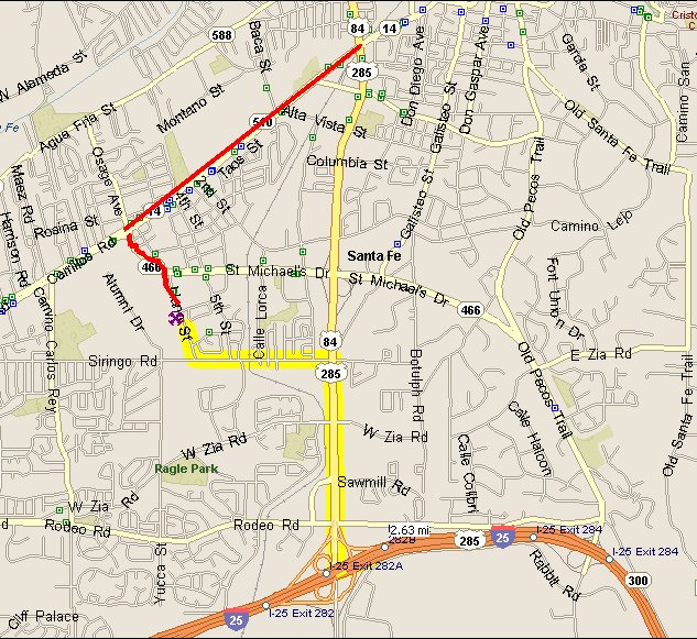 From US 85 southbound, turn right (southwest) on Cerrillos Rd.