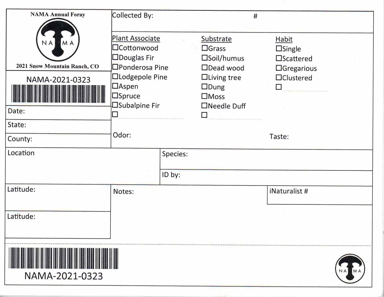 Field slip for 2021 NAMA Foray at Winter Park, Colorado.