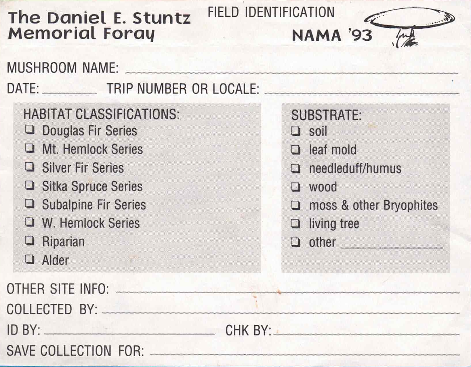 Field slip for 1993 Daniel E Stuntz Foray in Fort Worden, Washington. • Dimensions of this field slip are 4 ¼ x 5 ½". ~~~~~~~~~~~~~~~~ MycoWest.net/forays/field_slips/field_slip_nama_1993 dmw . 2o24-12-12