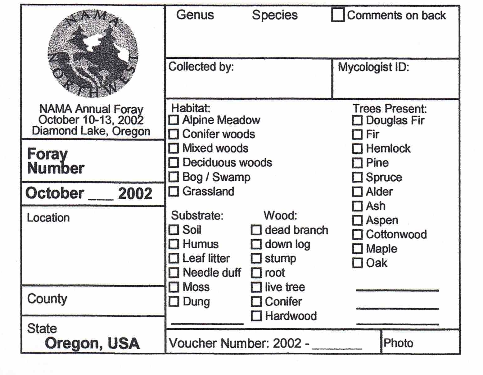 Field slip for 2002 Foray at Diamond Lake, Oregon. • Dimensions of this field slip are 4 ¼ x 5 ½". ~~~~~~~~~~~~~~~~ MycoWest.net/forays/field_slips/field_slip_nama_2002 dmw . 2o24-12-11